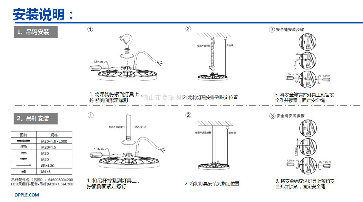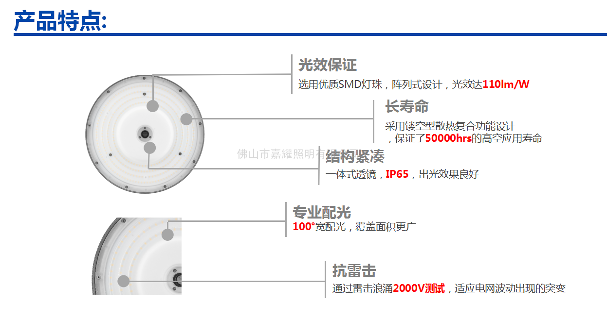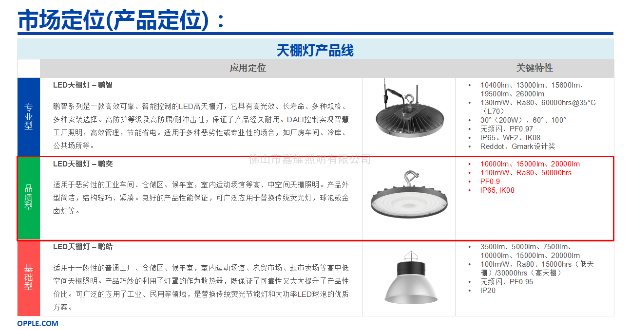 物料編碼 物料描述 功率(W) 功率因素(PF) 光通量(lm) 光效(lm/W) 色溫 顯色指數(Ra) 光束角 色容差(SDCM) 壽命(hrs) 防護等級(IP) 工作溫度(Ta_℃) 安裝方式 產品尺寸L*W*H(mm) 545001037600 LTP09095001-鵬奕Ⅲ-95W-857-100° 95 0.9 10,000 110 5700K >80 100° <6 50,000 IP65 -25 ~ +45 吊鉤、吊桿 φ280×131 545001037700 LTP09140001-鵬奕Ⅲ-140W-857-100° 140 0.9 15,000 110 5700K >80 100° <6 50,000 IP65 -25 ~ +45 吊鉤、吊桿 φ280×131 545001037800 LTP09185002-鵬奕Ⅲ-185W-857-100° 185 0.9 20,000 110 5700K >80 100° <6 50,000 IP65 -25 ~ +45 吊鉤、吊桿 φ321×137 -