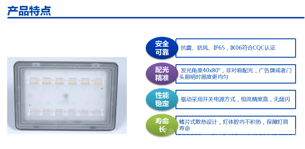 發光角度40x80°,非對稱配光,廣告牌或者門頭照明時照度更均勻