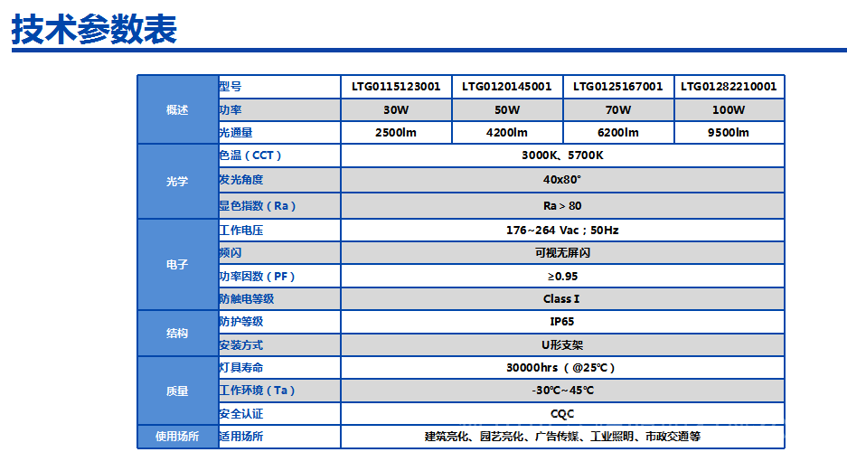 物料編碼 物料描述 主體材質 安裝方式 額定電壓 VAC 功率(W) 功率因素 光通量 lm 顯色指數 Ra 燈體顏色 產品尺寸(mm) L*W*H 安裝尺寸(mm) 發光角度(度) 色溫(K) 壽命(h) IP等級 裝箱數量 只/箱 543017025400 LTG0115123001-軒燁-30W-5700K-40x80-升級 壓鑄鋁 U形支架 220 30 0.95 2500 80 灰色 150x120x83 44 40x80° 5700 30000 IP65 18 543017025300 LTG0115123001-軒燁-30W-3000K-40x80-升級 壓鑄鋁 U形支架 220 30 0.95 2500 80 灰色 150x120x83 44 40x80° 3000 30000 IP65 18 543017025600 LTG0120145001-軒燁-50W-5700K-40x80-升級 壓鑄鋁 U形支架 220 50 0.95 4200 80 灰色 200x140x99 60 40x80° 5700 30000 IP65 12 543017025500 LTG0120145001-軒燁-50W-3000K-40x80-升級 壓鑄鋁 U形支架 220 50 0.95 4200 80 灰色 200x140x99 60 40x80° 3000 30000 IP65 12 543017025800 LTG0125167001-軒燁-70W-5700K-40x80-升級 壓鑄鋁 U形支架 220 70 0.95 6200 80 灰色 250x180x120 60 40x80° 5700 30000 IP65 6 543017025700 LTG0125167001-軒燁-70W-3000K-40x80-升級 壓鑄鋁 U形支架 220 70 0.95 6200 80 灰色 250x180x120 60 40x80° 3000 30000 IP65 6 543017026000 LTG -軒燁-100W-5700K-40x80-升級 壓鑄鋁 U形支架 220 100 0.95 9500 80 灰色 280x220x135 80 40x80° 5700 30000 IP65 6 543017025900 LTG -軒燁-100W-3000K-40x80-升級 壓鑄鋁 U形支架 220 100 0.95 9500 80 灰色 280x220x135 80 40x80° 3000 30000 IP65 6 -