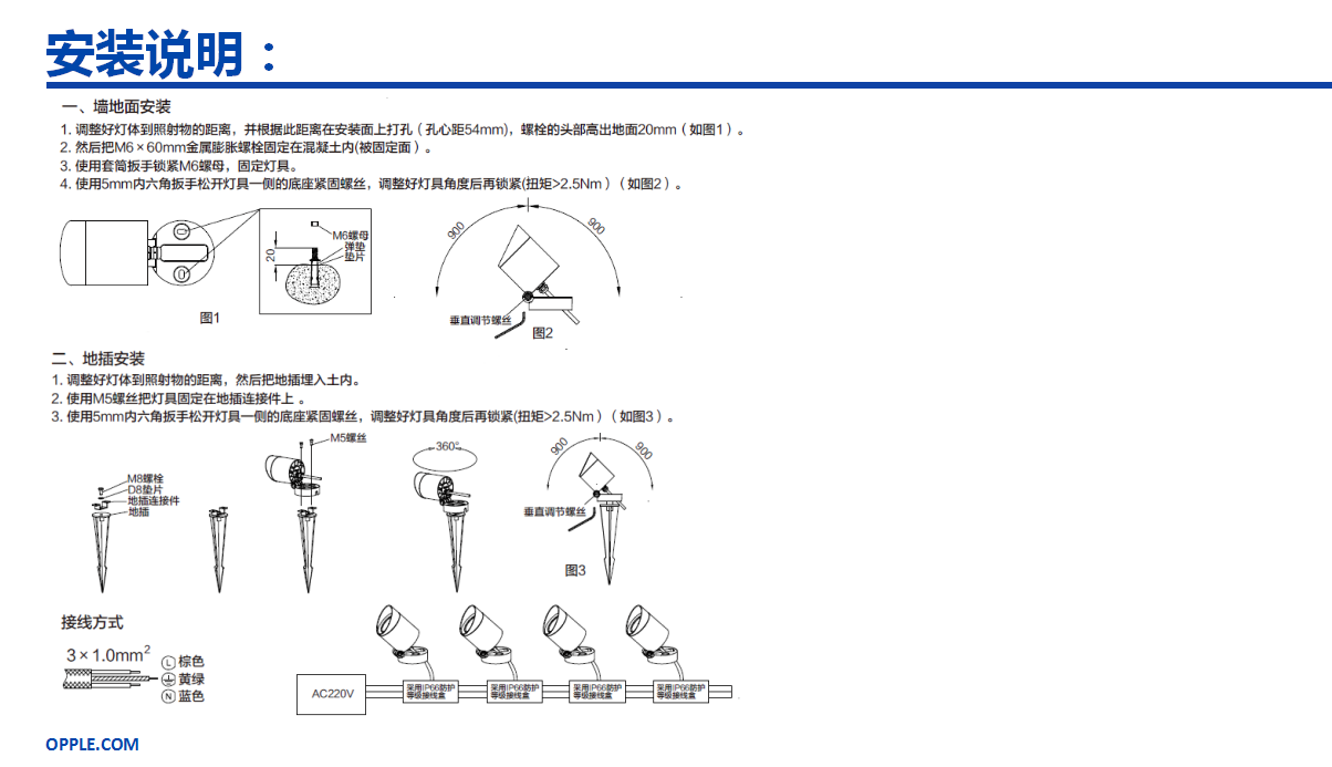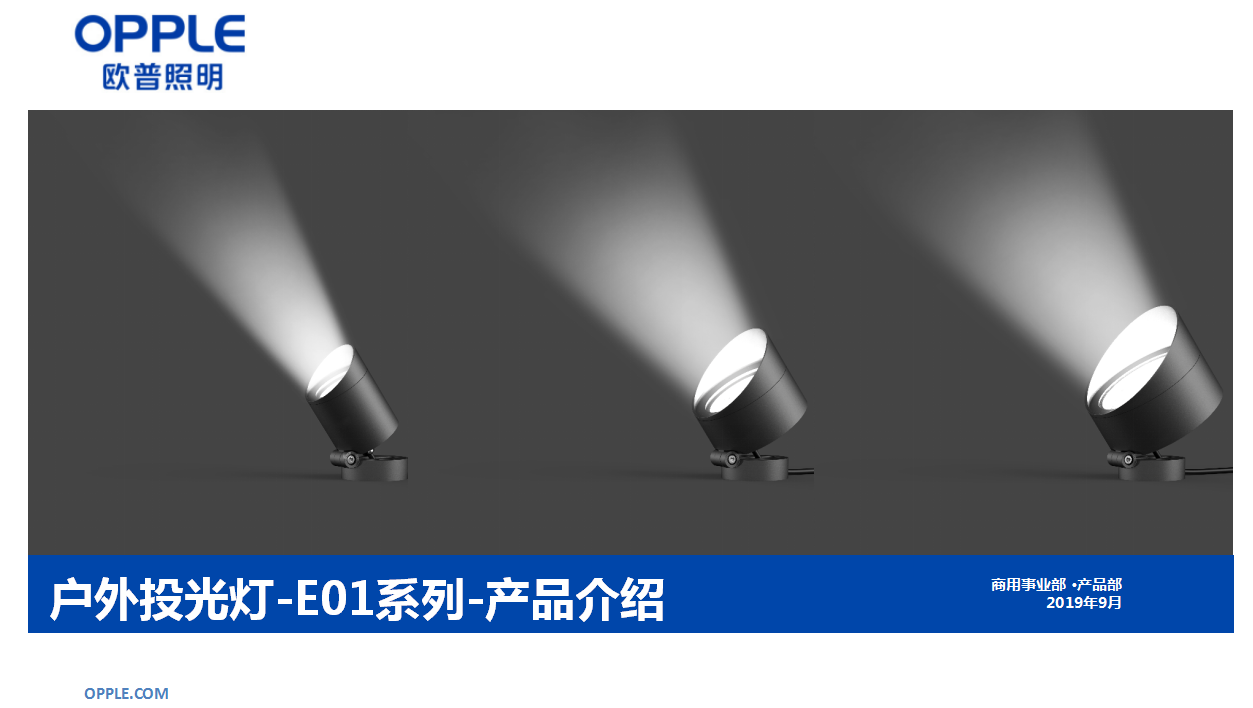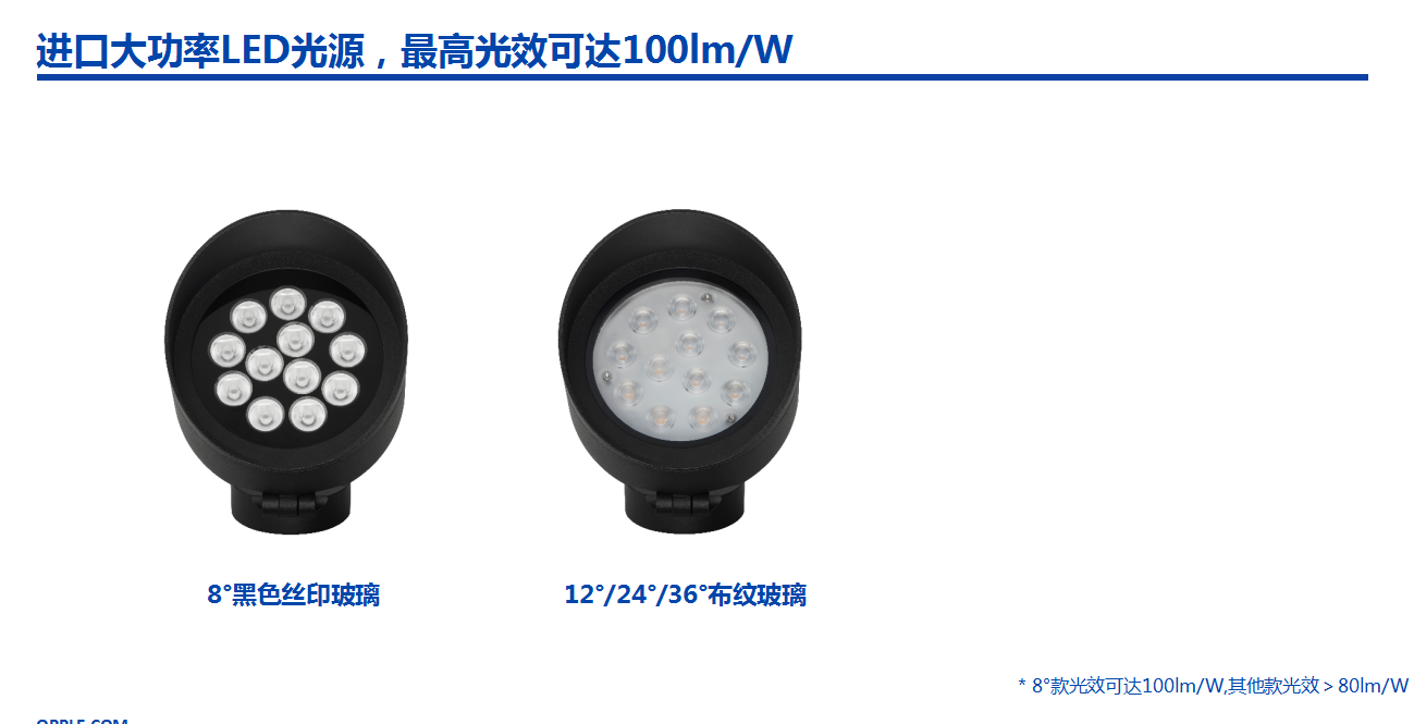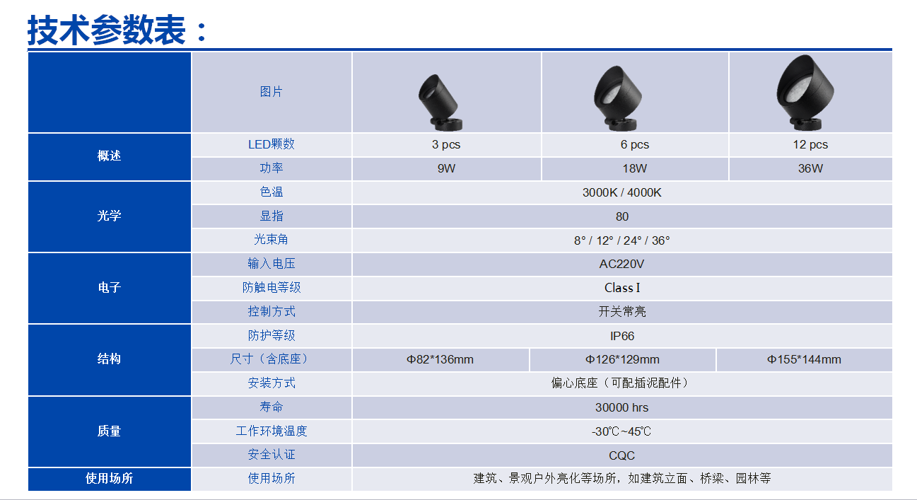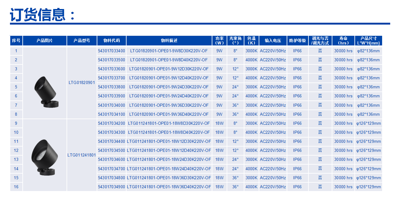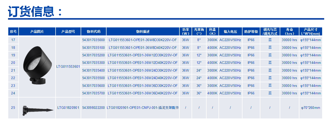 歐普照明E01戶外LED投光燈可選插地配件安裝多種發光角度景觀照明亮化專用投光燈訂貨型號和規格:序號 產品圖片 產品型號 物料代碼 物料描述 功率(W) 光束角(°) 色溫(K) 輸入電壓 防護等級 調光與否/調光方式 壽命(hrs) 產品尺寸L*W*H(mm) 1 LTG01820901 543017033400 LTG01820901-OPE01-9W8D30K220V-OF 9W 8° 3000K AC220V/50Hz IP66 否 30000 hrs φ82*136mm 2 543017033500 LTG01820901-OPE01-9W8D40K220V-OF 9W 8° 4000K AC220V/50Hz IP66 否 30000 hrs φ82*136mm 3 543017033600 LTG01820901-OPE01-9W12D30K220V-OF 9W 12° 3000K AC220V/50Hz IP66 否 30000 hrs φ82*136mm 4 543017033700 LTG01820901-OPE01-9W12D40K220V-OF 9W 12° 4000K AC220V/50Hz IP66 否 30000 hrs φ82*136mm 5 543017033800 LTG01820901-OPE01-9W24D30K220V-OF 9W 24° 3000K AC220V/50Hz IP66 否 30000 hrs φ82*136mm 6 543017033900 LTG01820901-OPE01-9W24D40K220V-OF 9W 24° 4000K AC220V/50Hz IP66 否 30000 hrs φ82*136mm 7 543017034000 LTG01820901-OPE01-9W36D30K220V-OF 9W 36° 3000K AC220V/50Hz IP66 否 30000 hrs φ82*136mm 8 543017034100 LTG01820901-OPE01-9W36D40K220V-OF 9W 36° 4000K AC220V/50Hz IP66 否 30000 hrs φ82*136mm 9 LTG011241801 543017034200 LTG011241801-OPE01-18W8D30K220V-OF 18W 8° 3000K AC220V/50Hz IP66 否 30000 hrs φ126*129mm 10 543017034300 LTG011241801-OPE01-18W8D40K220V-OF 18W 8° 4000K AC220V/50Hz IP66 否 30000 hrs φ126*129mm 11 543017034400 LTG011241801-OPE01-18W12D30K220V-OF 18W 12° 3000K AC220V/50Hz IP66 否 30000 hrs φ126*129mm 12 543017034500 LTG011241801-OPE01-18W12D40K220V-OF 18W 12° 4000K AC220V/50Hz IP66 否 30000 hrs φ126*129mm 13 543017034600 LTG011241801-OPE01-18W24D30K220V-OF 18W 24° 3000K AC220V/50Hz IP66 否 30000 hrs φ126*129mm 14 543017034700 LTG011241801-OPE01-18W24D40K220V-OF 18W 24° 4000K AC220V/50Hz IP66 否 30000 hrs φ126*129mm 15 543017034800 LTG011241801-OPE01-18W36D30K220V-OF 18W 36° 3000K AC220V/50Hz IP66 否 30000 hrs φ126*129mm 16 543017034900 LTG011241801-OPE01-18W36D40K220V-OF 18W 36° 4000K AC220V/50Hz IP66 否 30000 hrs φ126*129mm 序號 產品圖片 產品型號 物料代碼 物料描述 功率(W) 光束角(°) 色溫(K) 輸入電壓 防護等級 調光與否/調光方式 壽命(hrs) 產品尺寸L*W*H(mm) 17 LTG011553601 543017035000 LTG011553601-OPE01-36W8D30K220V-OF 36W 8° 3000K AC220V/50Hz IP66 否 30000 hrs φ155*144mm 18 543017035100 LTG011553601-OPE01-36W8D40K220V-OF 36W 8° 4000K AC220V/50Hz IP66 否 30000 hrs φ155*144mm 19 543017035200 LTG011553601-OPE01-36W12D30K220V-OF 36W 12° 3000K AC220V/50Hz IP66 否 30000 hrs φ155*144mm 20 543017035300 LTG011553601-OPE01-36W12D40K220V-OF 36W 12° 4000K AC220V/50Hz IP66 否 30000 hrs φ155*144mm 21 543017035400 LTG011553601-OPE01-36W24D30K220V-OF 36W 24° 3000K AC220V/50Hz IP66 否 30000 hrs φ155*144mm 22 543017035500 LTG011553601-OPE01-36W24D40K220V-OF 36W 24° 4000K AC220V/50Hz IP66 否 30000 hrs φ155*144mm 23 543017035600 LTG011553601-OPE01-36W36D30K220V-OF 36W 36° 3000K AC220V/50Hz IP66 否 30000 hrs φ155*144mm 24 543017035700 LTG011553601-OPE01-36W36D40K220V-OF 36W 36° 4000K AC220V/50Hz IP66 否 30000 hrs φ155*144mm 25