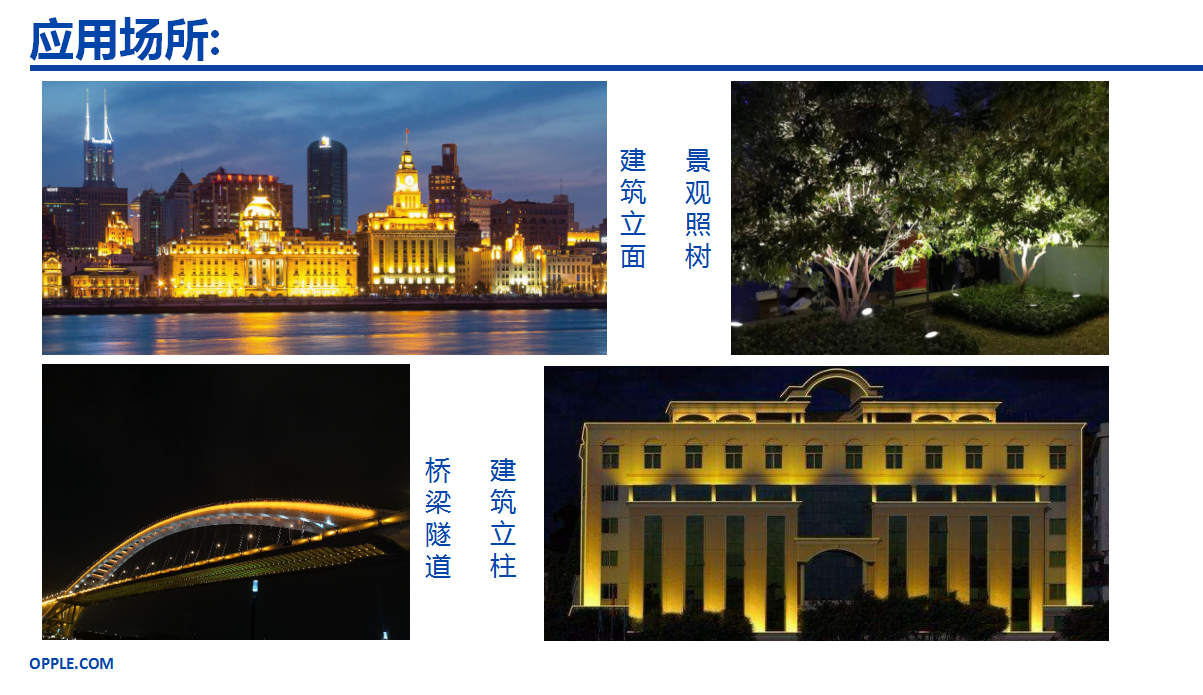 歐普E01戶外LED投光燈的使用場地:建筑、景觀戶外亮化等場所,如建筑立面、橋梁、園林等