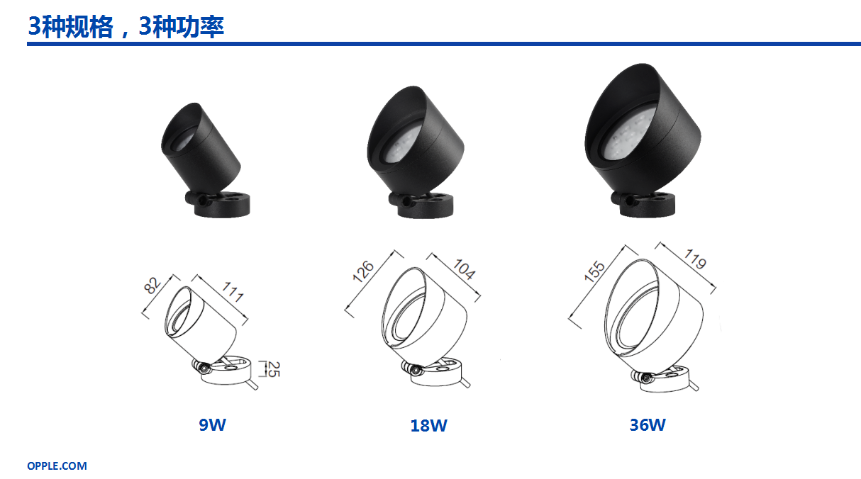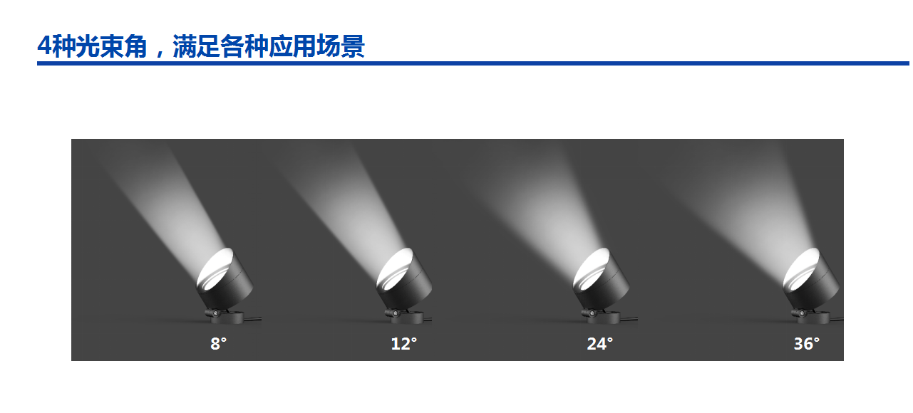 一體化燈體設計,外觀簡約、精致,4種光束角(8° 12° 24° 36°),滿足各種應用場景,3種規格,3種功率(9W 18W 36W),大功率LED光源,*高光效可達100lm/W,一體化結構設計,散熱良好
