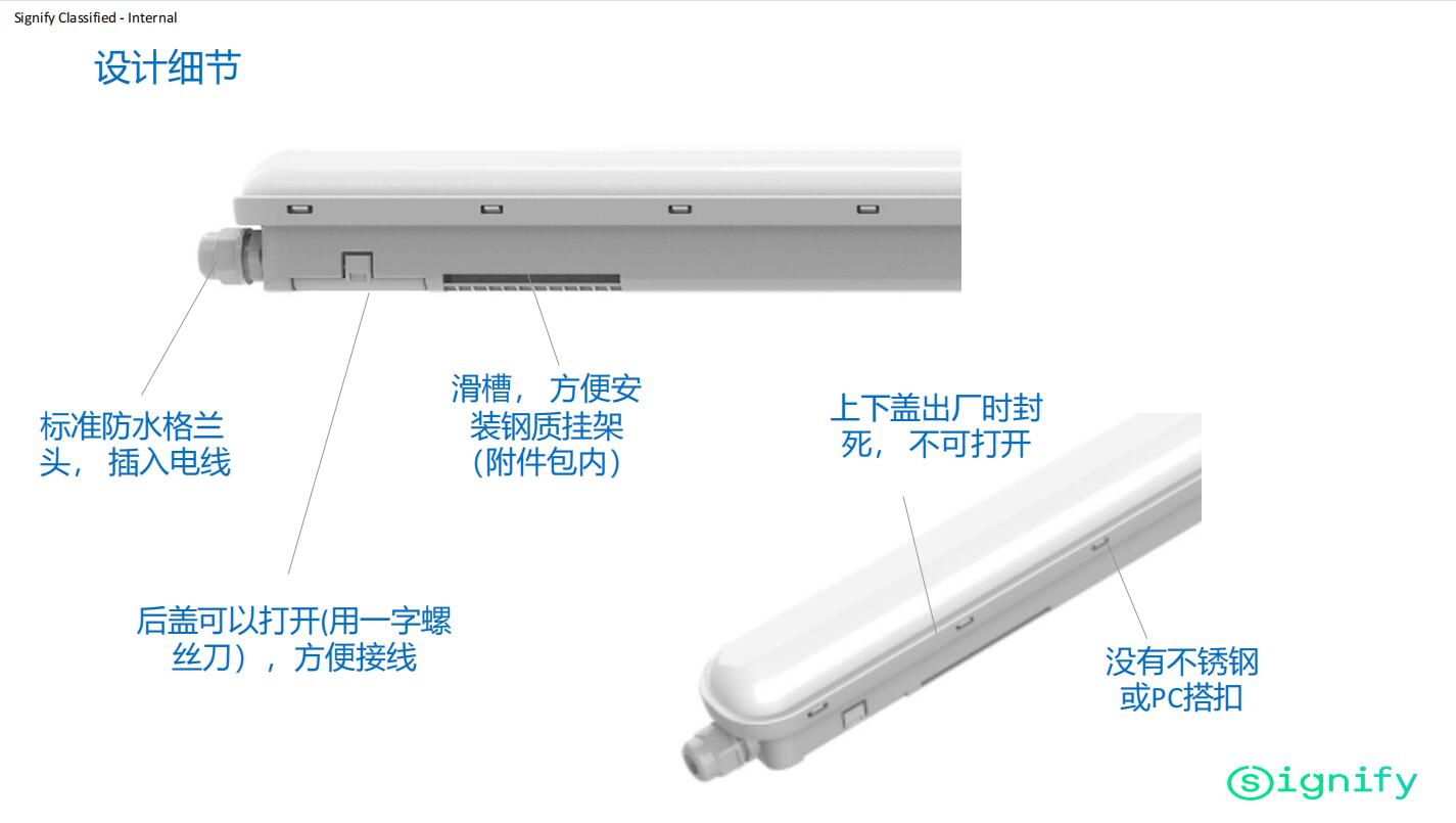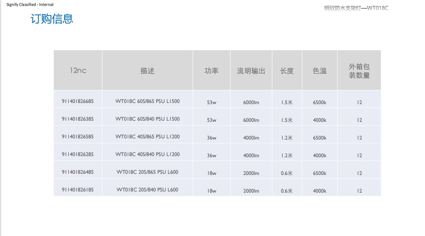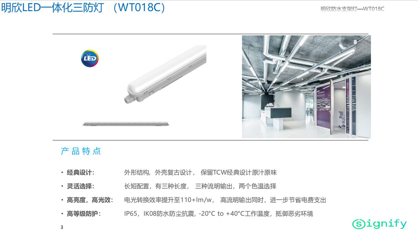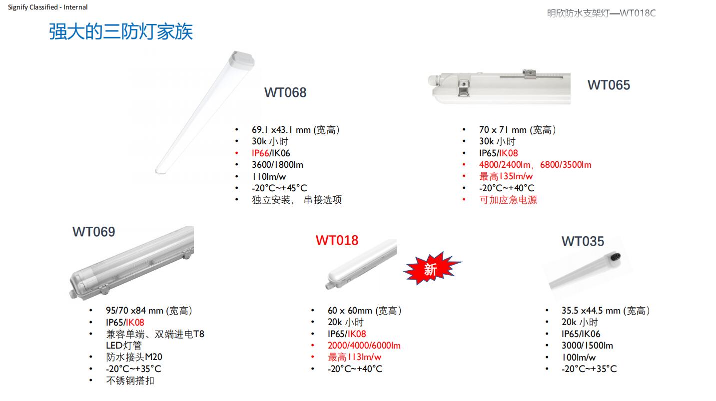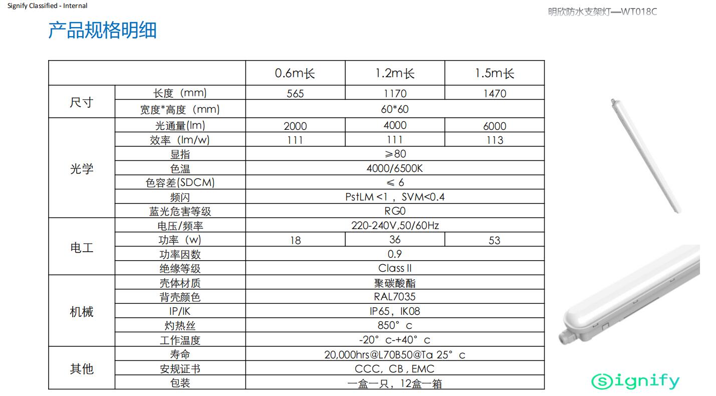 飛利浦明欣防水支架燈WT018C一體化三防燈的產(chǎn)品特點:• 經(jīng)典設(shè)計:外形結(jié)構(gòu), 外殼復(fù)古設(shè)計, 保留TCW060三防支架燈的經(jīng)典設(shè)計原汁原味• 靈活選擇:長短配置,有三種長度(18W 0.6米、36W 1.2米、53W 1.5米), 三種流明輸出(2000LM/4000LM/6000LM),兩個色溫選擇(4000K/6500K)• 高亮度,高光效: 電光轉(zhuǎn)換效率提升至110+lm/w, 高流明輸出同時,進(jìn)一步節(jié)省電費支出• 高等級防護(hù):IP65,IK08防水防塵抗震, -20°C to +40°C工作溫度,抵御惡劣環(huán)境 -